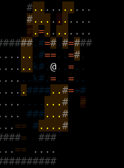 Some roguelikes have chasms where you can fall or jump deeper into the dungeon, which is something I wanted in my game. While, Brogue for instance simply shows dark squares for the chasm, I had the idea that the player would be able to faintly see the level below, so I tried to implement that. In this image, the dark/faint squares to the left and right of the character are actually the next level down. So, once I code in the ability to fall between levels, you'll be able to see what's below should you jump, fall, or get pushed of the edge of a precipice.